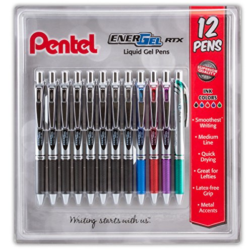 Pentel EnerGel RTX Retractable Liquid Gel Pen, 0.7mm Black/Blue/Red/Green/Violet Ink, 12 Pack (BL77O12C)