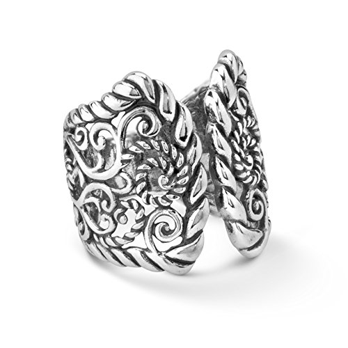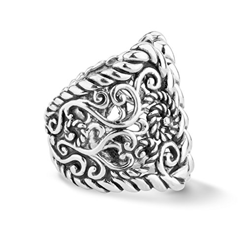 -. Feature : Sterling silver ring / Open shank ring with rope and scroll motif / Measures approximately 7/8" long x 3/4"wide / Designed and crafted in America / Polished signature design with openwork swirls with rope border and open center of the ring.