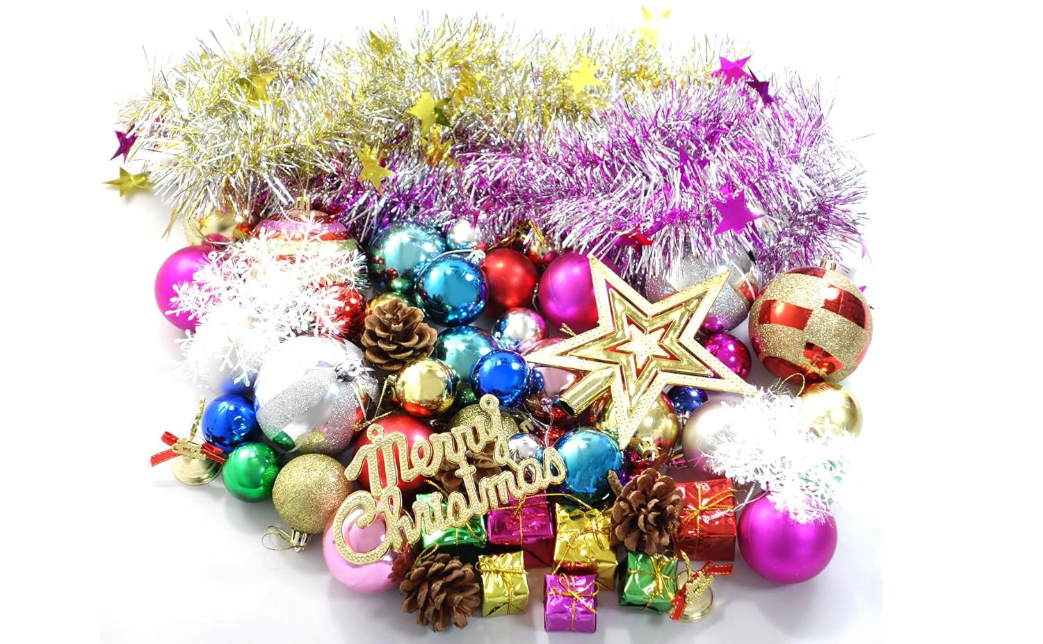 お得なセット、ど~~んと60点! 色々なカラフルなオーナメントがアソートで盛りだくさん入っています。 セット内容 : 48点のオーナメント各種、雪の結晶×9点、キラキラモール×2点、ツリートップスター×1点 48点のオーナメント・モールの色はランダム組み合わせのため、パッケージにより若干異なります ※配送時のオーナメントボールの破損に備え、48点の各種オーナメントに、さらに数点多めに加えております ※画像ツリーサイズは150cmです。ツリーは付属致しません