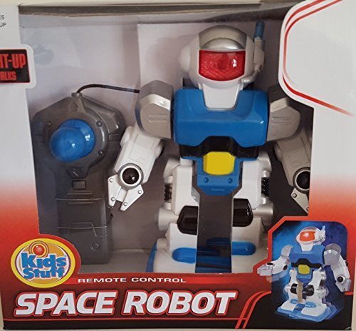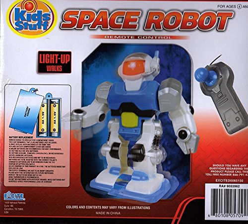 -. Binding : Toy -. Brand : Kid Stuff -. Color : white -. EAN : 0680108057092 -. Feature : Kids Stuff - RA 9033962 / Remote Control - blue and white Space Robot / Lights-up and walks with remote control / For ages 4 and up / Uses two AA 1.5V batteries -. IsAdultProduct : 0 -. Label : Excite -. LegalDisclaimer : Ages 4 and up -. Manufacturer : Excite -. MPN : 9033962 -. PackageQuantity : 1 -. PartNumber : 9033962 -. ProductGroup : Toy -. ProductTypeName : TOYS_AND_GAMES -. Publisher : Excite -. Studio : Excite -. Title : Remote Controlled Space Robot -. UPC : 680108057092