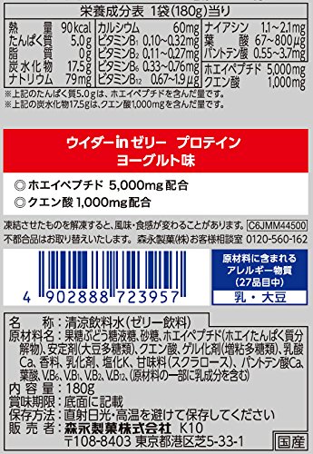 原材料 : 果糖ぶどう糖液糖、砂糖、ホエイペプチド(ホエイたんぱく質分解物)、安定剤(大豆多糖類)、クエン酸、ゲル化剤(増粘多糖類)、乳酸Ca、香料、乳化剤、塩化K、甘味料(スクラロース)、パントテン酸Ca、葉酸、V.B6、V.B1、V.B2、V.B12、(原材料の一部に乳成分を含む)