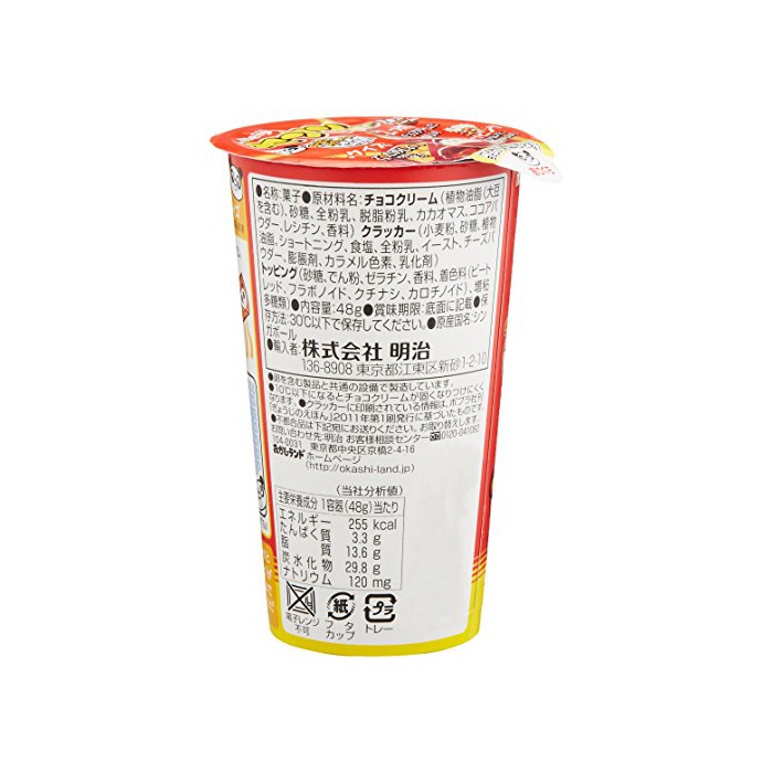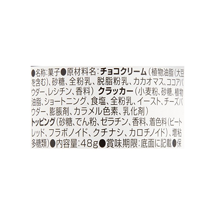 원재료:초콜렛 크림(식물성 기름지(대두를 포함한다)고, 설탕,전분유,탈지분유,카카오 마스,코코아 파우더,레시틴,향료) 크랙커(소맥분,설탕,식물성 기름지,쇼트닝,식염,전분유,이스트,치즈 파우더,팽창 제,카라멜 색소,유화 제(대두를 포함한다)) 토핑(설탕,나오지 않겠 분,젤라틴,향료,착색료(비트 레드,후라보노이드,치자나무,카로 치노 이 드)고, 증점다당류)