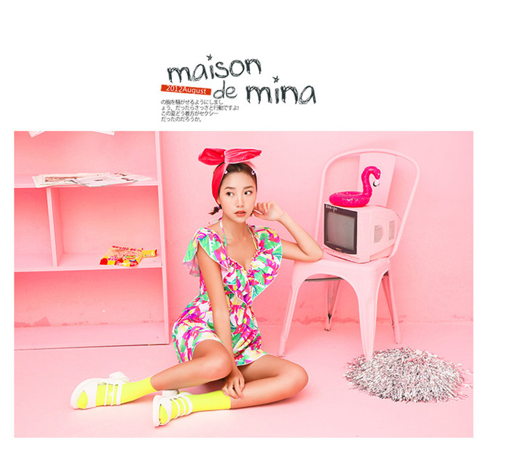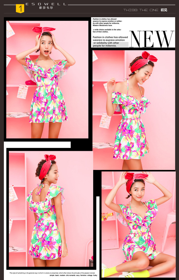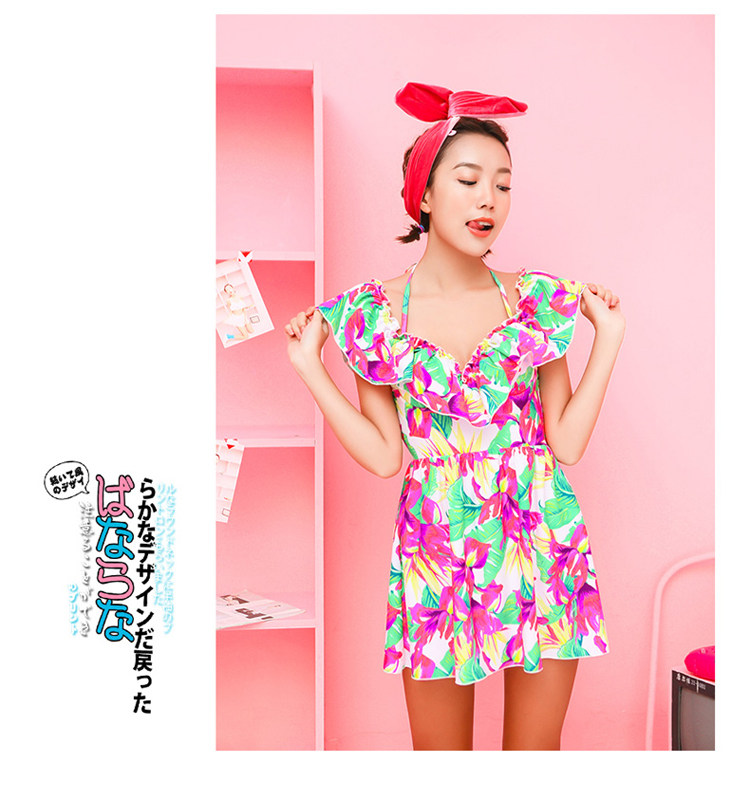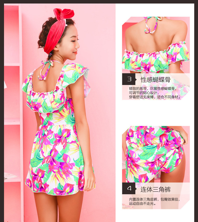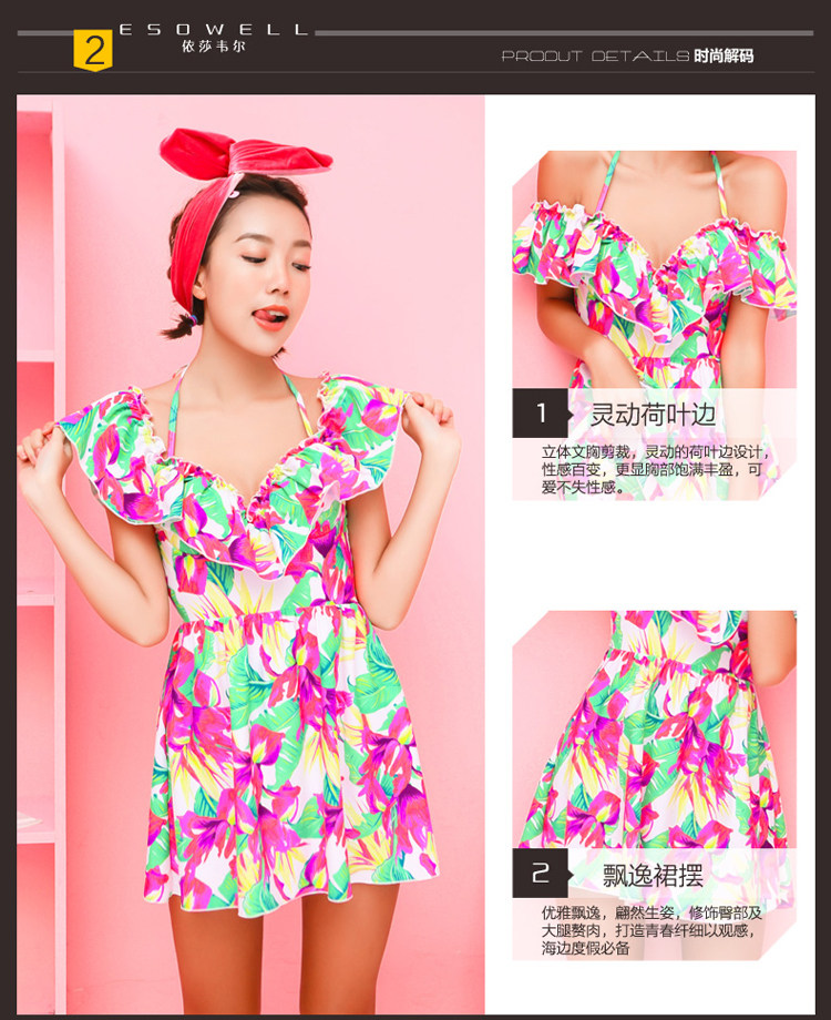 夏季裙式连体泳装女大胸小胸钢托聚拢遮肚显瘦荷叶印花保守游泳衣