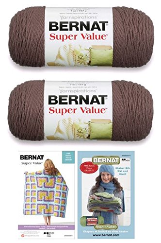 Bernat Super Value Med (4) Weight Yarn, 7 Oz Taupe (2-Pack) With 2 Bernat Patterns