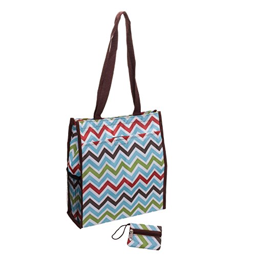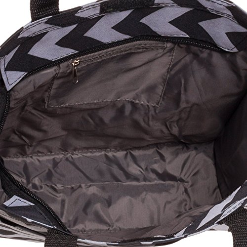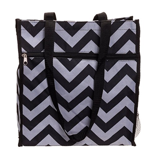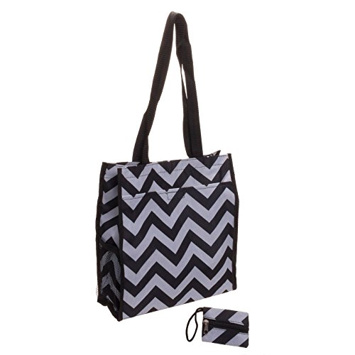 Use this stylish Black and White Chevron 13" Tote Bag for toting your essentials to the pool, beach, or even to work. Exterior features include dual carry handles in black, zippered pocket on front side and Velcro tab pocket on back side along with a mesh water bottle holder. A trendy black and white chevron pattern adorns the front, back, and bottom. The interior zippered compartment with additional Velcro tab closure features gray polyester lining and a small zippered pocket on one side. A removable zippered pouch attaches to either handle. Measures 13" x 12" x 5" Depth with 14" handle drop.