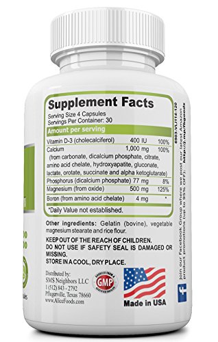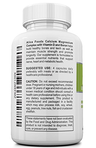 -. Binding : Health and Beauty -. Brand : Alice Foods -. EAN : 0808939353651 -. Feature : POTENT AND EFFECTIVE - Alice Foods Calcium-Magnesium health supplement offers a perfect blend of Calcium and Magnesium to ensure high efficacy. Unlike supplements with calcium alone, which can result in cardiovascular risks and exacerbate the calcium deficiency problem, the presence of magnesium in our supplement ensures effective absorption and retention of calcium - thus letting you enjoy health benefits of calcium and magnesium together! / HEALTHY BONES AND TEETH - Calcium deficiency results in poor bone density which in turn leads to brittle and weak bones, easy fractures and tooth decay. The consumption of right dosage of calcium helps in building up and strengthening of the bones and teeth. Be it teens, men or women, everyone needs to make up for calcium deficiency through one or the other way as majority of American population is seen to have calcium deficiency - Calcium Supplement is an easy way! / PREVENTION FROM DISEASES - Our supplement may help prevent diseases like Osteoporosis and arthritis and may lower bad Cholesterol. Moderate cases of calcium deficiency may lead to Cramps, Joint pains, Increased cholesterol levels, Slow pulse rates, and Insomnia. Magnesium deficiency can result in anxiety, times of hyperactivity, difficulty getting to sleep, difficulty staying asleep. / BENEFITS OF VITAMIN D - The presence of Vitamin D makes the absorption of Calcium and Phosphorus in body even more effective, which is the main parameter that defines performance of any Calcium Supplement. In addition, it also may help facilitate normal immune system function, growth and development of bones and teeth. / 100% SAFE AND FDA APPROVED FACILITY - All Alice Food supplements are Made in USA at a GMP Certified, FDA inspected and approved facility. You can be completely confident that Alice Foods manufacturing processes are designed to give top priority to your health such that you only benefit in every possible way. Available with Subscribe and Save -. IsAdultProduct : 0 -. Label : SMS Neighbors LLC -. Manufacturer : SMS Neighbors LLC -. MPN : 1001 -. PackageQuantity : 120 -. PartNumber : 1001 -. ProductGroup : Health and Beauty -. ProductTypeName : HEALTH_PERSONAL_CARE -. Publisher : SMS Neighbors LLC -. Studio : SMS Neighbors LLC -. Title : Calcium Magnesium Vitamin D Boron Complex - Effective Calcium Absorption and Retention - Best Value for Money - 120 Capsules in the Package - Better than Tablets, Pills and Powder -. UPC : 808939353651