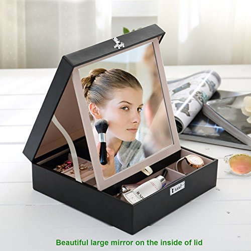 Suitable For Home and Travel. --Three Parts -- Double layer structure, 3.7L capacity. ① Dimensions: 9.96*9.96*3.42inch ; ②Portable Mini Jewelry Box with cosmetic mirror Dimensions: 2.95*5.52*1.38inch ③ Interlayer ; Dimensions: 9.05*6.1*1.97*inch. Environmental PU Fabric, Green Harmless, Application of Pregnant Women.