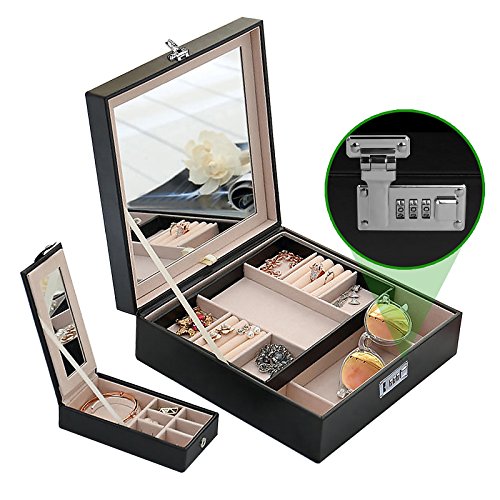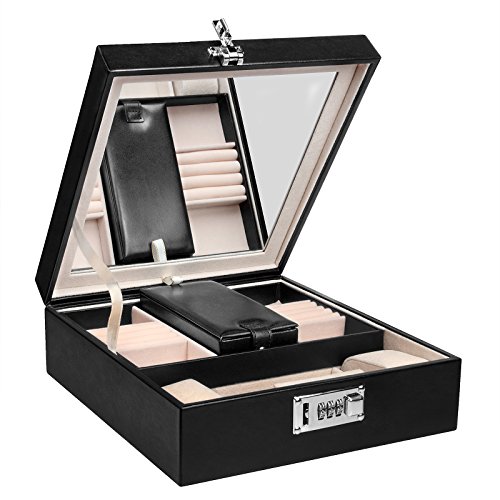 Combination Lock Jewelry Box Organizer For Women With Large Mirror 2 Trays 23 Separate Compartments Black