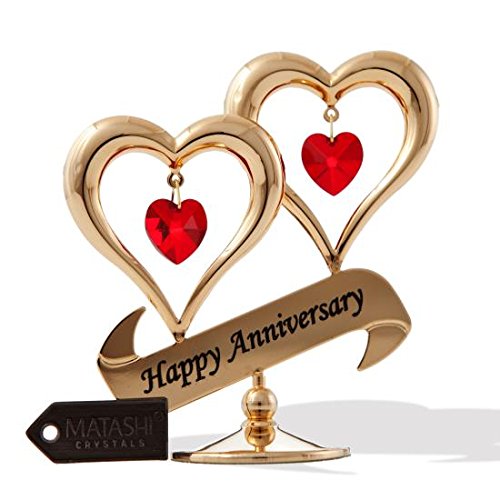 Feature : EYE-CATCHING DESIGN: Two delicate hearts with dangling crystals suspended inside hang above a Happy Anniversary inscribed banner. Crafted with quality materials like 24K Gold and studded with precision cut Matashi® crystals. / DIMENSIONS: 3.5 x 1.5 x 3.5 inches (weighs 0.01 pounds). The size ensures it is the perfect size for any interior design motif, home décor or collection! With the stable base, you can spruce up your desk or place on a table top to make any room nicer and remind you of your special someone. / ELEGANT PACKAGING: Comes secured in a velvet pouch within a luxury gift ready box. Write a personal message on the provided gift card and be assured of your product authenticity with the included official Matashi® individually serialized warranty card. / GIFT READY: The perfect gift for the special person in your life. Give as a gift on any Anniversary to celebrate the time you have spent together. The perfect ornament to cement your love and celebrate your relationship. / SATISFACTION GUARANTEED: All Matashi® products are covered by a 100% Money-Back satisfaction guarantee and craftsmanship is guaranteed under a 2 year limited warranty.