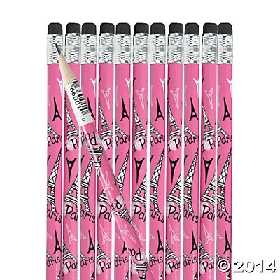 These Perfectly Paris Pencils will put Paris on the mind! Featuring a tres chic Paris print with fun Eiffel Tower illustrations, these wooden pencils will add a litle joie de vivre to your Perfectly Paris party. Drop these #2 pencils in your Paris party goody bags or give them away as rewards to encourage writing. Paris, je t'aime! These Pencils have #2 lead. Wood. (2 dozen per unit) 7 1/2"Feature