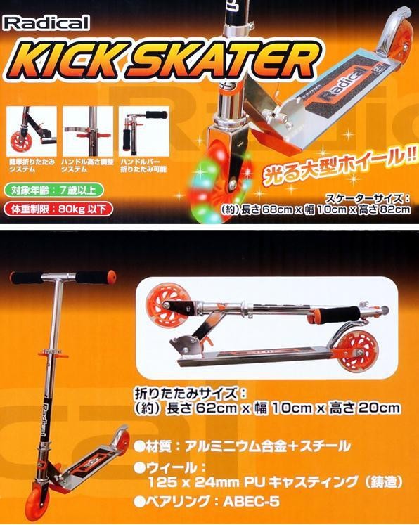 LED内蔵で、走るとウィールが光るキックスケーターです。 製造国:中国 素材・材質:本体:アルミニウム合金+スチールウィール:PUキャスティングベアリング:ABEC-5 商品サイズ:使用時:長さ68×幅10×高さ82cm 重量:約2.6kg 仕様:対象年齢:7歳以上体重制限:80kg以下 ※サプライヤー直送品【商品名】Radical 光るキックスケーター オレンジ・NLS585