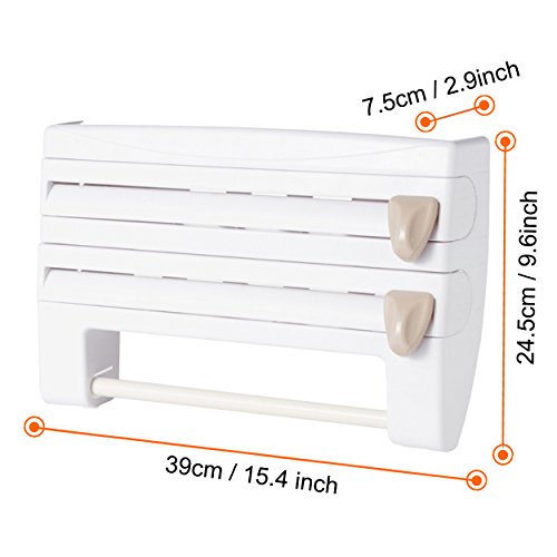 - [Caution] The product can only hold standard sized roll of plastic wrap,tin foil,and paper towel.(plastic wrap & tin foil size:Diameter <1.7inch,length<12.5inch;paper towel:Radius<1.7inch,length<10.5inch);Larger sized rolls can not contained in the product.If you are used to use large rolls of plastic wrap,tin foil or paper towel,please do not order this product. Product material:ABS Plastic.Product appro dimension:15.4"x2.9"x9.6" (LxWxH)