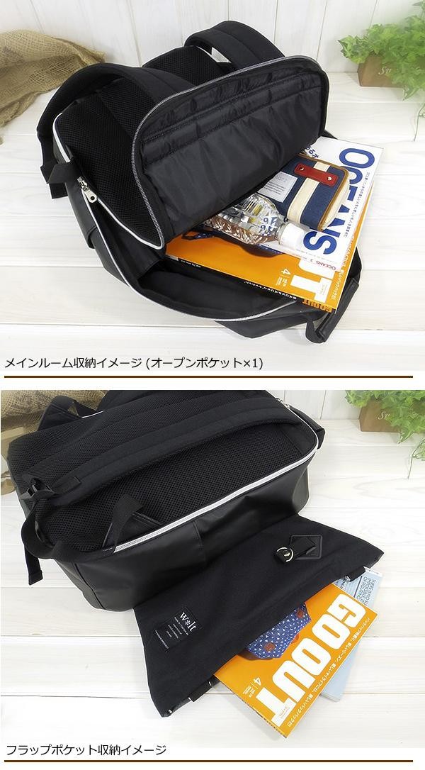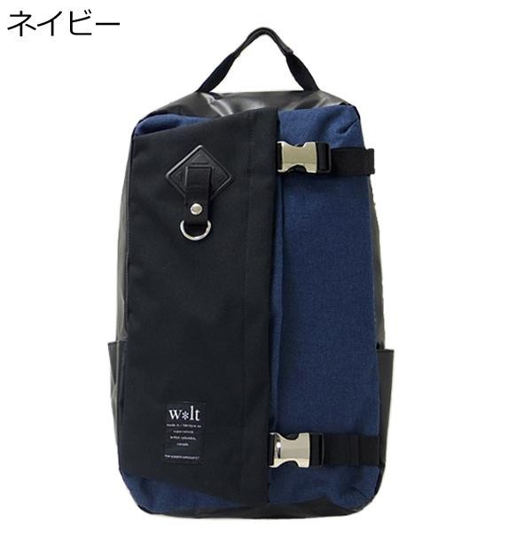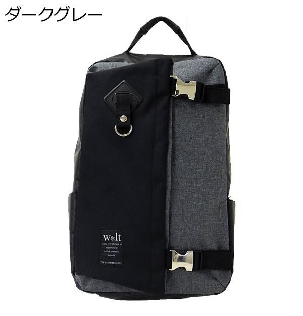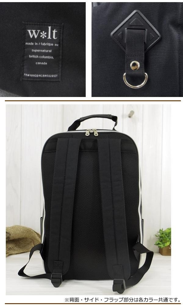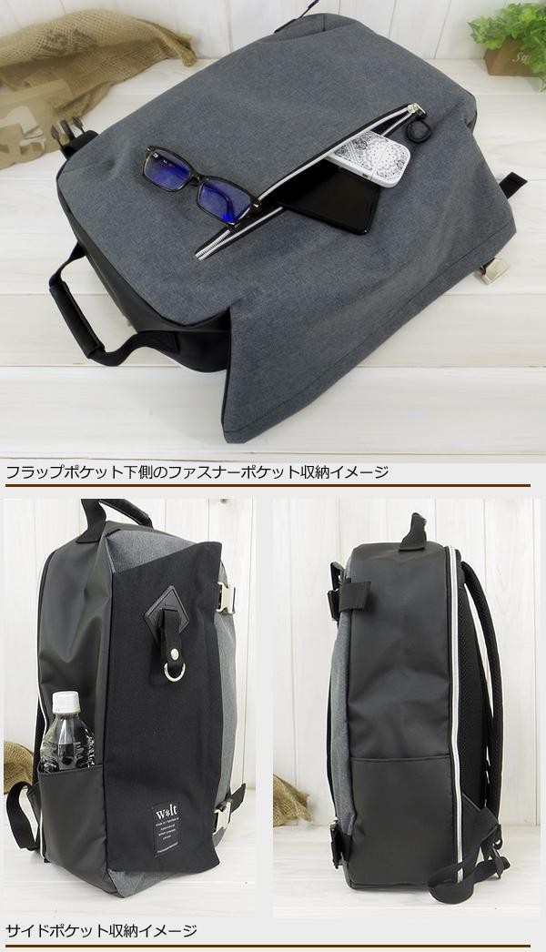| フロントにはバックル付のフラップポケットが付いており、フラップ部分にも収納が可能です。フラップポケットの下側にもポケットがあります。ペットボトルが収納可能なサイドポケットもついた、お洒落なメンズボックス型のリュックです。 |