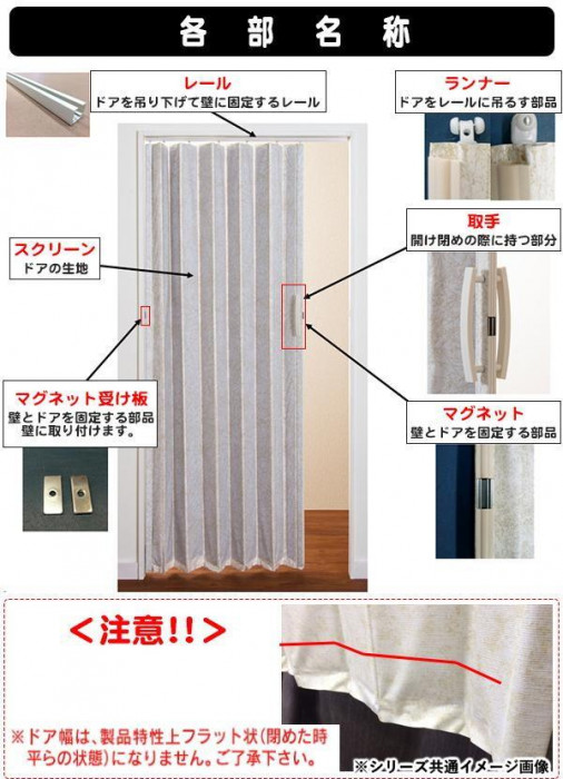 | 素材・材質 | スクリーン:PVC(t:0.15) レール:PVC 取手:ABS リードエッジ:スチール(ユニクロームメッキ) マグネット受け板:スチール(ユニクロームメッキ) ランナー:ポリアセタール 中芯:段ボール 木ネジ:スチール(ユニクロームメッキ) |