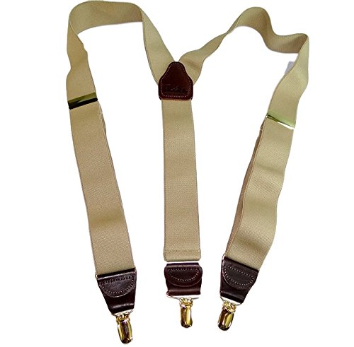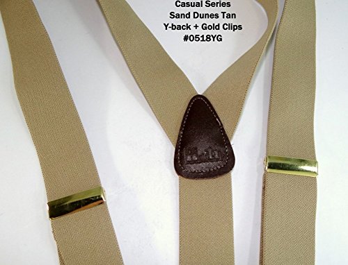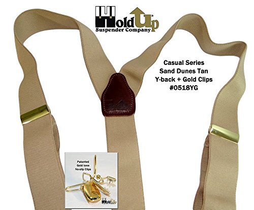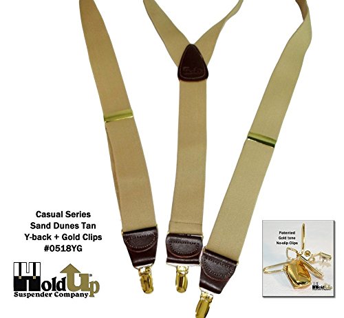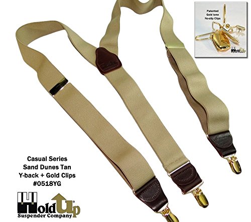 Binding : Apparel Product Description Holdups® Casual Series in a SAND DUNES light tan solid colored men's suspender featuring our patented no-slip® clip in a gold finish with matching length adjuster. These are 1 1/2" wide and 48" long (adjustable). This Y-back style goes with all shirt colors and is great for office or casual wear when you need to make a conservative fashion statement! Great as a birthday or Father's Day gift. All materials are carefully chosen for elastic durability with a fine weave and top grade brown leather Y-back crosspatch and tabs is embossed with Holdup® Logo. If you need a pair of suspenders that perform year after year...then we'd always suggest a pair of Holdup® Suspenders for you or a friend. All Holdup® Casual series suspender braces all have: Top quality elastic cloth specifically chosen for durability and lasting stretch. All come with the best brown saddle leather tabs that vary in size and taper front to back for more comfort and convenience when attaching them to your pants.... This series features our patented No-Slip® Suspender Clip guaranteed to never slip, slide, or fly like all other suspenders do. No matter how much you spend or how often your have a tailor sew on suspender buttons the net result will never equal a pair of Holdup® suspenders! Truly a good investment in comfort, fit and style. 0
