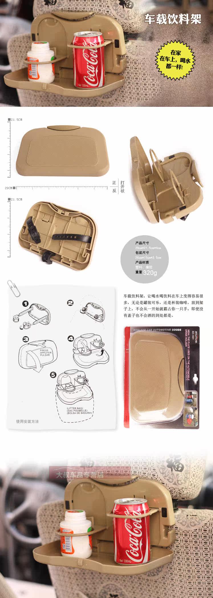 Car drink holder, so drink a drink in the car a lot easier, whether it is canned cola or cup of coffee, put on the shelf, not from the outset to occupy your hand, even without the lid does not spill everywhere.Weight: 320gProduct size: 29cm * 21.5cm * 4cmPacking size: 26cm * 15cm * 3.5cmMaterial: plastic, rubber