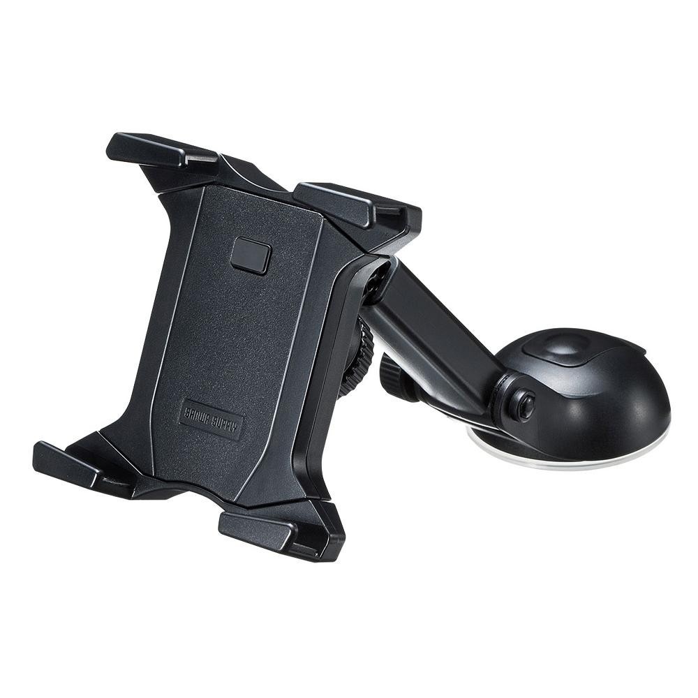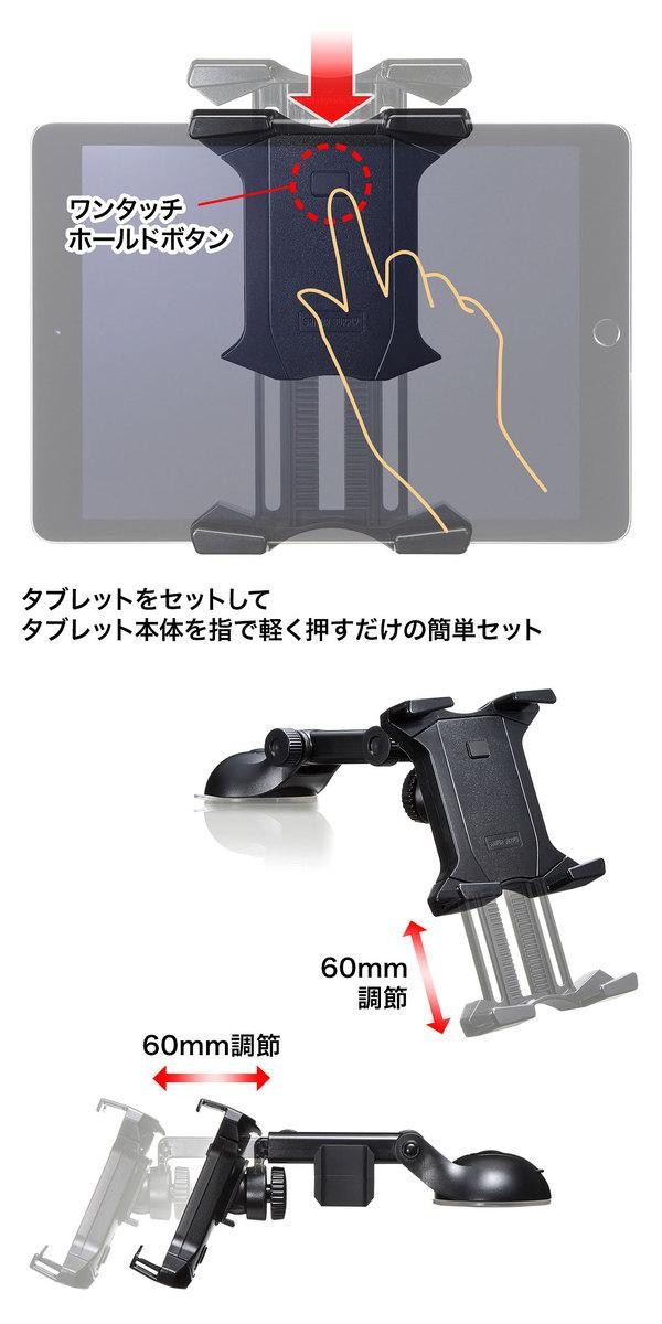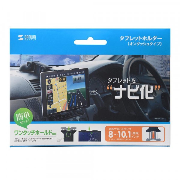 | 10インチサイズまでのタブレットを取り付けられるタブレット用の車載ホルダーです。ホルダー部分にタブレットをセットして、タブレット本体を指で軽く押すだけでホールドできるワンタッチホールド機能により、簡単にタブレットをホルダーにホールドすることができます。 |