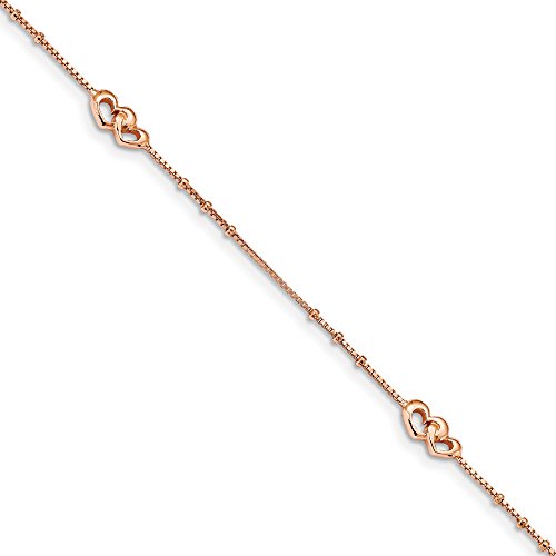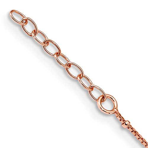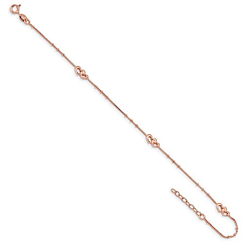 Anklets are a great way to add fun, flash and a feminine touch. This classic design made from rose-tone plated sterling silver features a 0.8mm width box chain, 1.5mm bead accents and 5 x 10mm heart station links. It is adjustable in length from 9 to 10 inches and closes with a spring ring clasp.Feature