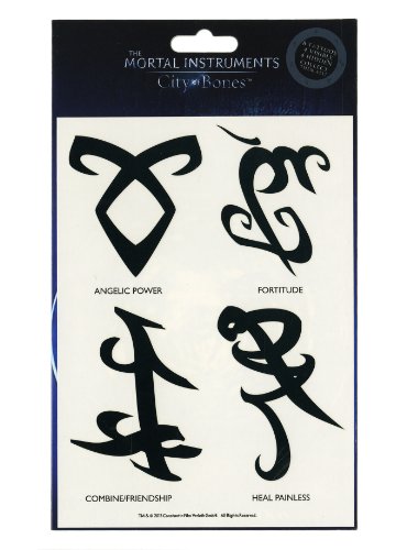 -. Feature : With The Mortal Instruments City of Bones Temporary Tattoo Set you too can apply powerful runes to your skin! / Much like many of the runes in the movie The Mortal Instruments: City of Bones , these tattoos are temporary and fade with time. / Runes in the assortment include: 'Courage in Combat,' 'Angelic Power,' 'Strength,' and 'Deflect/Block.' / Which runes will you wear? / Ages 8 and up.