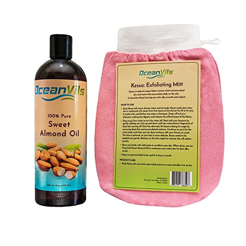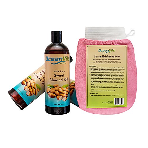 - ✔ BONUS EXFOLIATING GLOVE - The best and most natural way to exfoliate your skin, scrub away dead skin cells, and reduce cellulite. Stimulates the skin, increasing blood flow to the exfoliated area and giving a smooth, clean glow anywhere on the body. Combined with the almond oil, creates wonderfully smooth and supple skin.