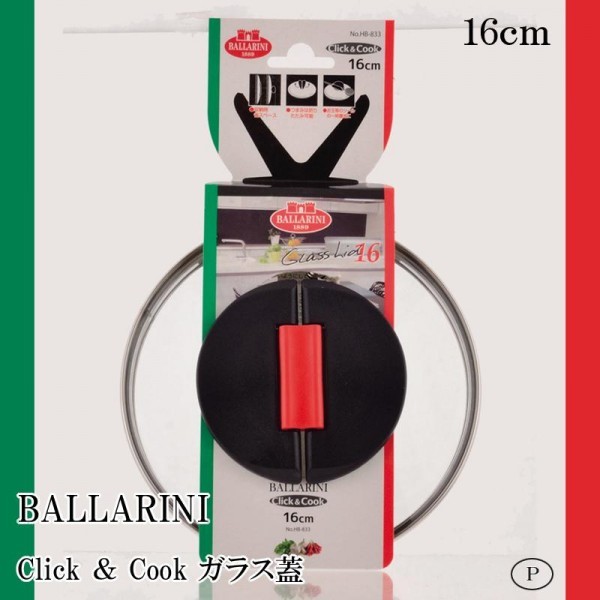 BALLARINI Click&Cook(16cm)用のガラス蓋です。蓋のツマミは、使用時は立ち上げ、使わない時は倒すことができます。 |