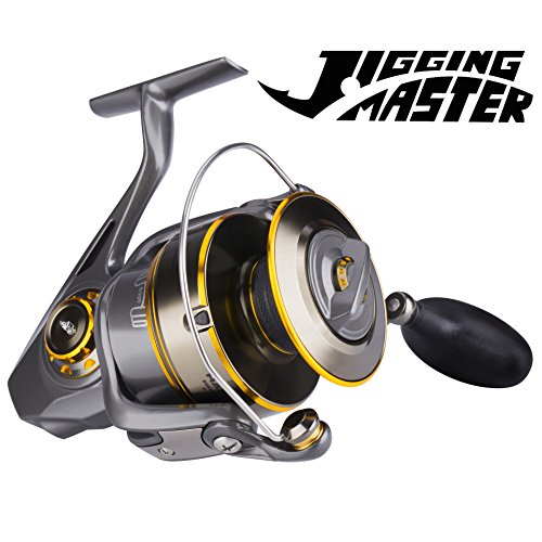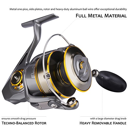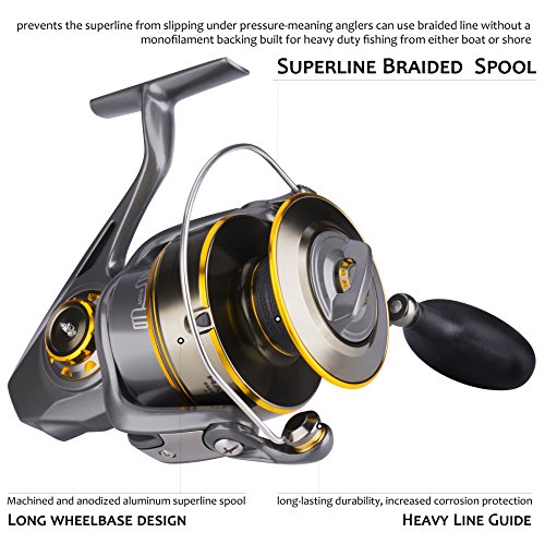 -. Feature : Powerful, corrosion resistant saltwater spinning reel built for heavy-duty surf casting and jigging fishing from either boat or shore / 6 sealed stainless steel ball bearings with instant infinite anti reverse system, delivers unparalleled smoothness and excellent resists corrosion on saltwater / Fishing reel with carbon fiber drag washers and long wheelbase design spool, giving you the finesse and power needed to subdue a variety of hard-pulling fish species, max drag of 50 lbs / Mechanically sealed drag system and Dura-Drag prevent saltwater infiltration and corrosion, and offer extreme protection from sand / One-piece full metal body provides extra-strength, side plate keeps precise gear alignment with rotor under heavy loads, and heavy-duty aluminum bail wire offer exceptional durability