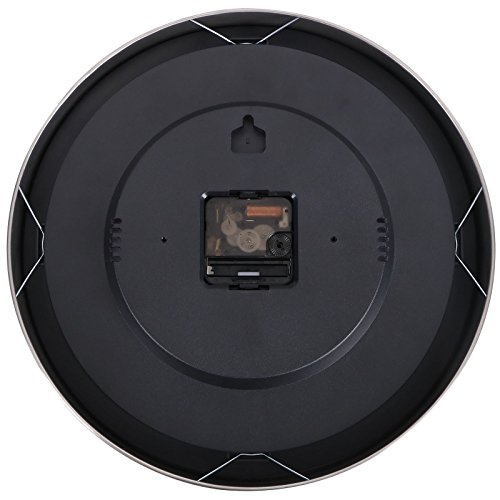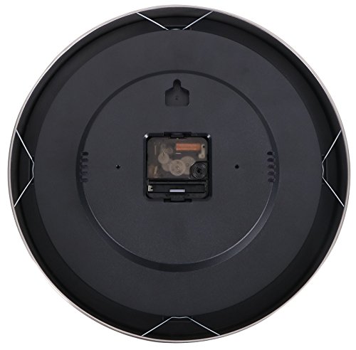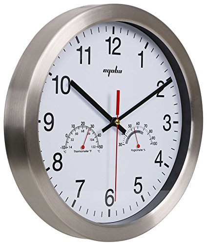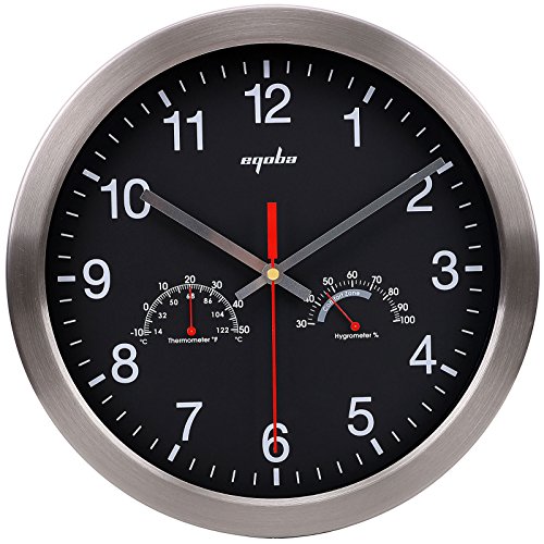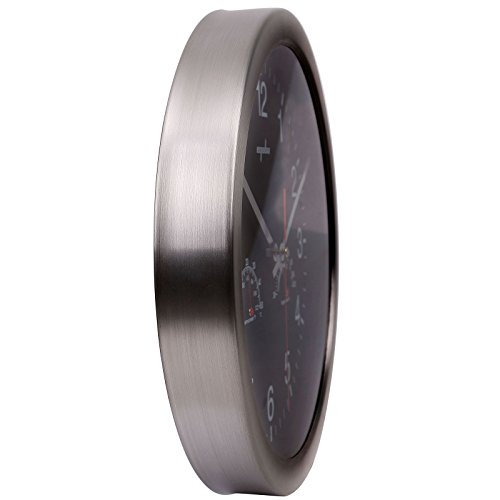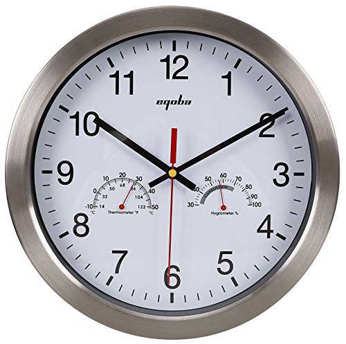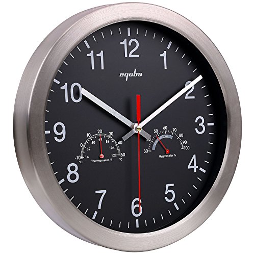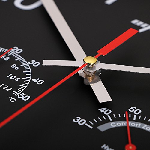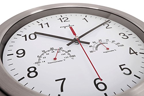 -. Feature : Large Wall Clock - Stainless steel bezel frame w/ glass lens / 12" Quartz clock - silent non-ticking movement / Requires one AA battery (not included); Easy install back nail slot / Large numbers make it easier to read from a distance / Includes thermometer (Thermo Range: -10℃-+50℃) & hygrometer (Humidity range30-100%); Perfect sturdy & simple minimalist wall clock for any room decoration