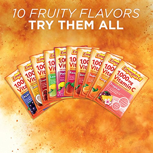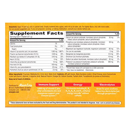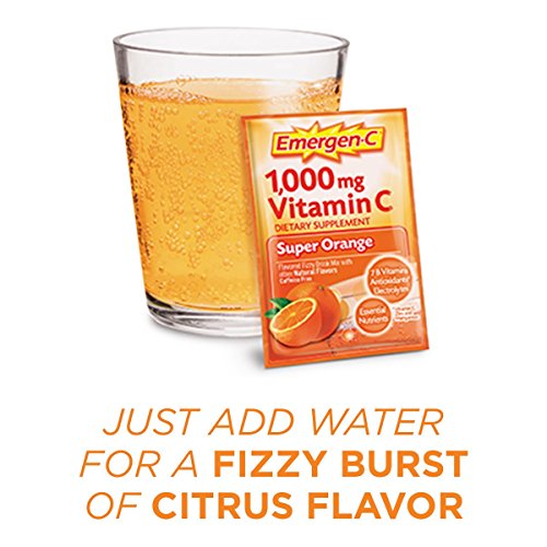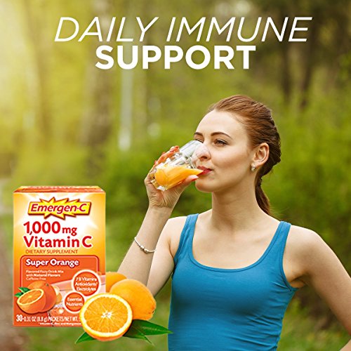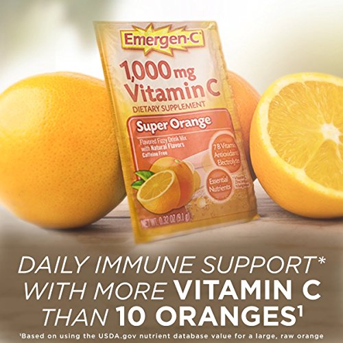 Why settle for a good day when you can have a super one? Emergen-C Vitamin C drink mix is a great way to help support your immune system with Vitamin C as part of your daily wellness routine.* Emergen-C dietary supplement provides 1,000 mg of Vitamin C – more than 10 oranges (1) – and is packed with B Vitamins. Contains other antioxidants (2) for immune system support, plus electrolytes to help replace any that are lost during your daily workout*. Emergen-C vitamin drink mixes are made with natural, real fruit flavors, plus they have no artificial sweeteners and are caffeine free. Just add to 4 to 6 ounces of water for a fizzy, citrus-y boost of goodness. With more than 20 tasty flavors plus a variety of special formulas, Emergen-C dietary supplements make it deliciously easy to support your wellness goals. Transform your day, every day, with Emergen-C. (1) Based on using the USDA.gov nutrient database value for a large, raw orange (2) Antioxidants include Vitamin C, Zinc and Manganese (3) Emergen-Zzzz is a dietary supplement for occasional sleeplessness * These statements have not been evaluated by the Food and Drug Administration. This product is not intended to diagnose, treat, cure, or prevent any disease.Feature