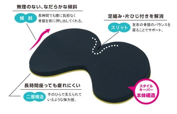 ご使用中の椅子などに敷いて座るだけで、骨盤のバランスをとり、健康的な姿勢が長時間キープ出来る、姿勢のサポートクッションです。座ると骨盤が立ち上がるように矯正され、背骨のS字カーブが本来の形に導かれるので、腰が前に出て背筋がスッと伸びた美しい姿勢になります。また、正しい姿勢が保てることで、腰への負担を軽減。コンパクトサイズなので、持ち運びもラク。デスクワーク時やご出張のお供にも。 |