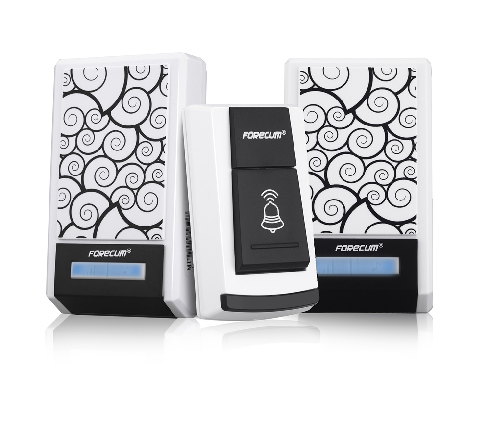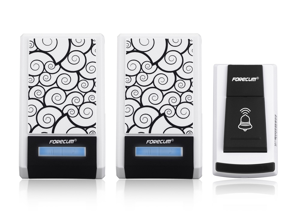 Wireless battery operated doorbell system of 1 transmitter and 2 receivers.