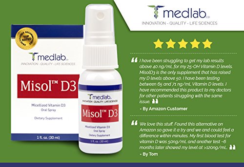-. Binding : Health and Beauty -. EAN : 0865678000086 -. Feature : 48 HOUR Discount over 50%! / NANOTECHNOLOGY D3 PROVIDES HIGHEST ABSORPTION - Our patent pending process has reduced Vitamin D3 liquid to particles significantly smaller (50 times) than your blood cells (ProP.R.Ietary process) so Vitamin D3 is in your bloodstream within MINUTES! (See graph of absorption rates in our images) / HIGH POTENCY 5000 IU - This is 5000 IU that goes directly into your blood stream in minutes rather than loosing 80 - 90% absorption when you take tablets or capsules / SIMPLY SPRAY TWICE PER DAY IN YOUR MOUTH - No Pills or Capsules to take and more efficient than sublingual tablets, just a very fine peppermint flavored 'mist' to spray which maximizes exposure through your Oral Mucosa (your mouth). ZERO goes into your digestive system like other tablets and capsules and all of it goes directly into your body! / BYPASSES YOUR DIGESTIVE SYSTEM - Our Vitamin D3 doesn't have to have to travel through your digestive system where physical conditions and malabsorption problems may hinder uptake and use. -. IsAdultProduct : 0 -. Label : InMed Technologies -. Manufacturer : InMed Technologies -. PackageQuantity : 1 -. ProductGroup : Health and Beauty -. ProductTypeName : HEALTH_PERSONAL_CARE -. Publisher : InMed Technologies -. Studio : InMed Technologies -. Title : Misol Vitamin D3 (5000 IU) Oral Spray, 1 Ounce -. UPC : 865678000086