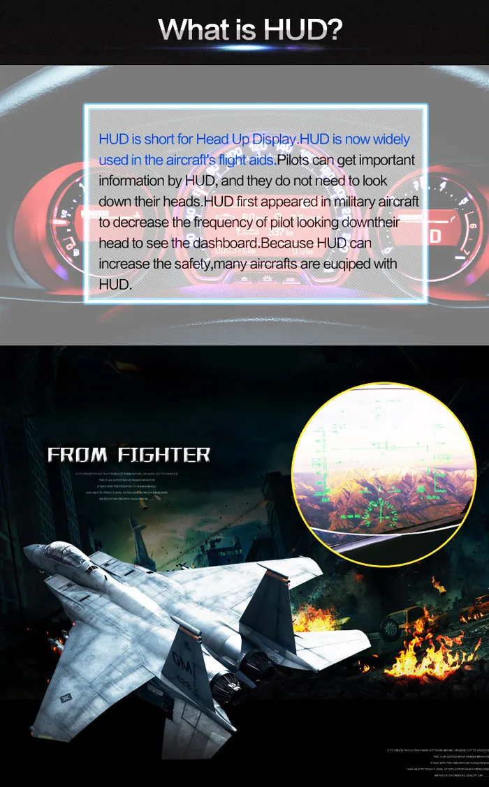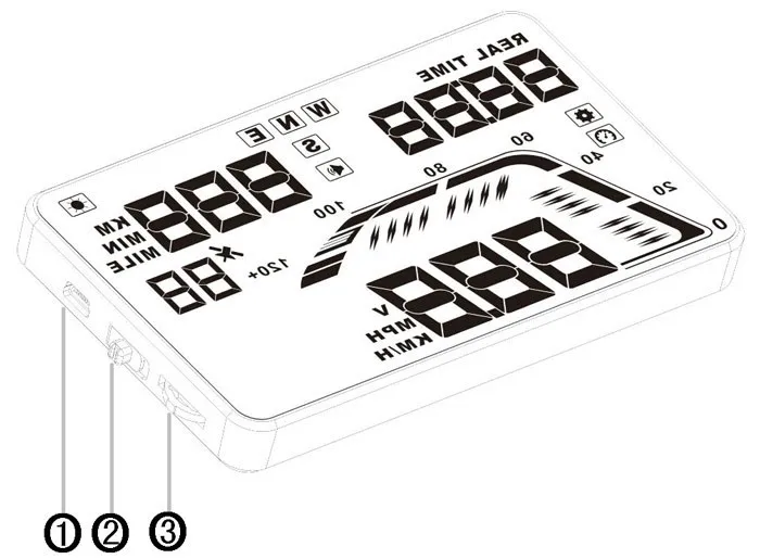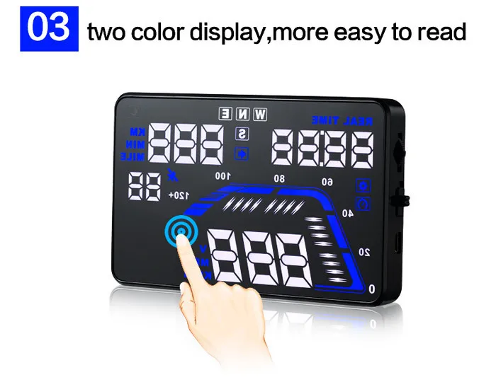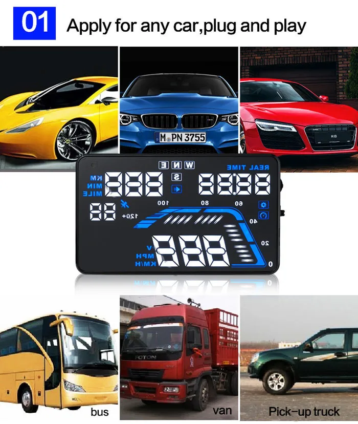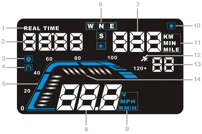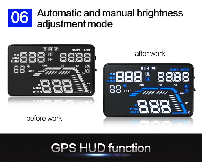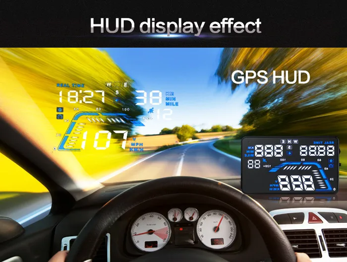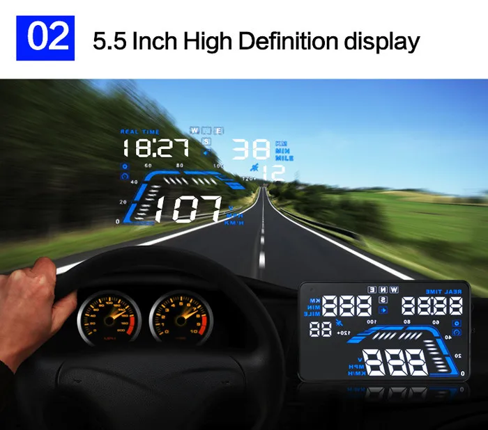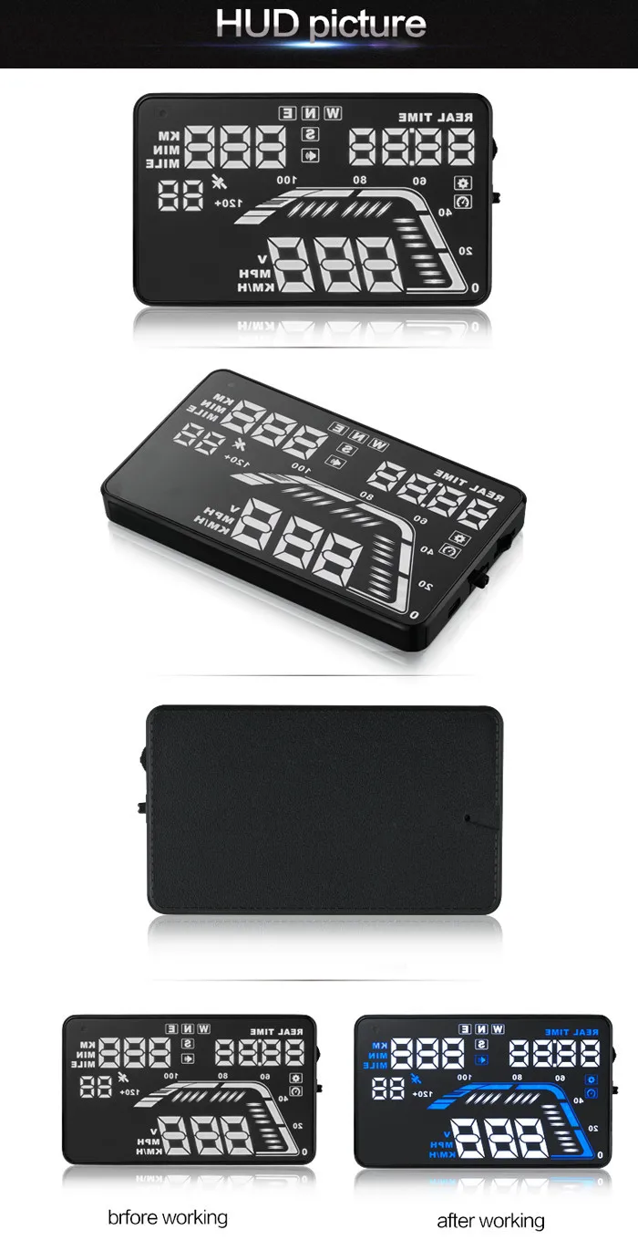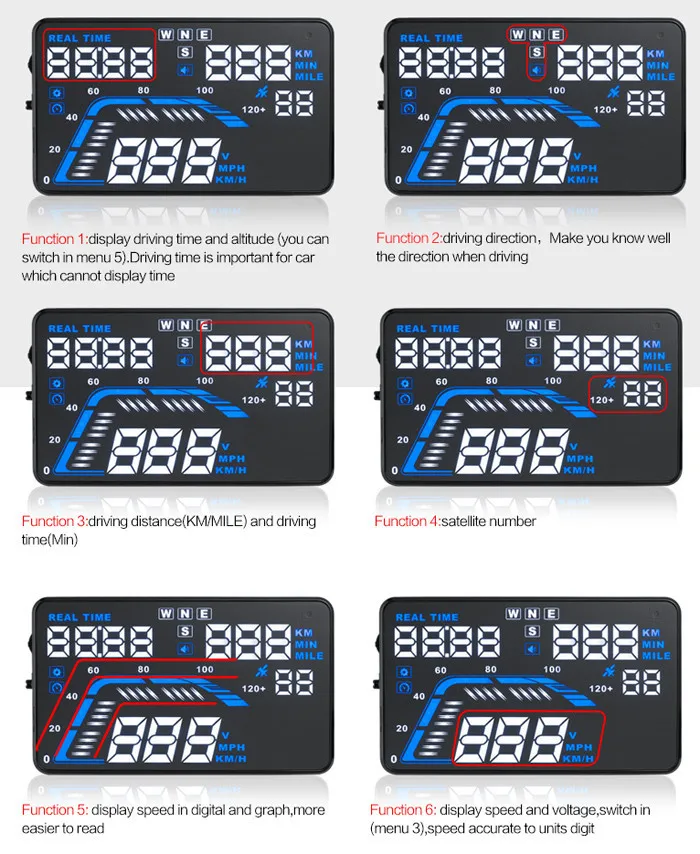 -Projects a lot of driving information onto a transparent film on your windshield such as speed, local time, driving direction, mileage, traveling hour, satellite number, altitude, over-speeding alarm, KM/mile free shifting.