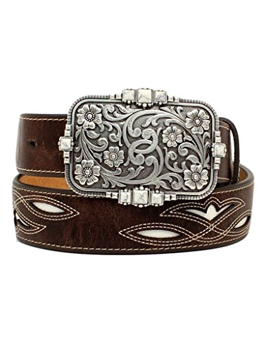 Studio : Ariat Publisher : Ariat Binding : Apparel Product Description This ladies Ariat belt by medium and f western products is perfect to pair with your favorite jeans. It features a cream underlay stitched design on a brown strap. Its neutral colors will go with so much in your wardrobe. It also comes with a western floral buckle with cream colored stones on the edges. 0