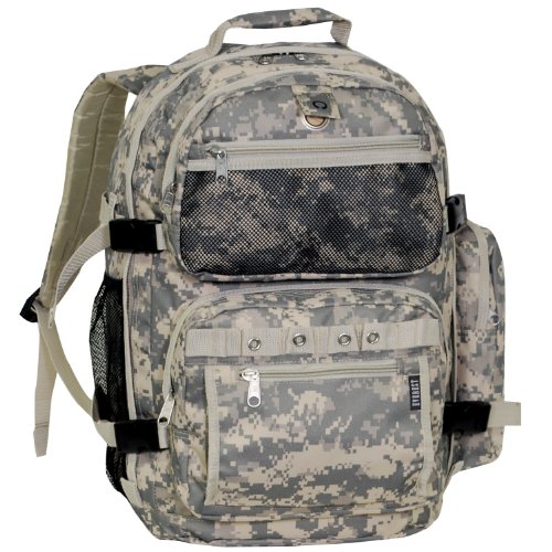 -. Binding : Apparel -. Brand : Everest -. Color : Camouflage -. Department : unisex-adult -. Feature : An oversize backpack for heavier loads / -Extra large main compartment / -One front zippered organizer pocket for easy access / -Another front zippered pocket with an internal music pouch and wire port / -Multiple compression straps for stability and comfort -. Label : Everest Lage -Child Vendor Code -. Manufacturer : Everest Lage -Child Vendor Code -. NumberOfItems : 1 -. PackageQuantity : 1 -. ProductGroup : Apparel -. ProductTypeName : LAGE -. Publisher : Everest Lage -Child Vendor Code -. Studio : Everest Lage -Child Vendor Code -. Title : Everest Oversize Digital Camo Backpack
