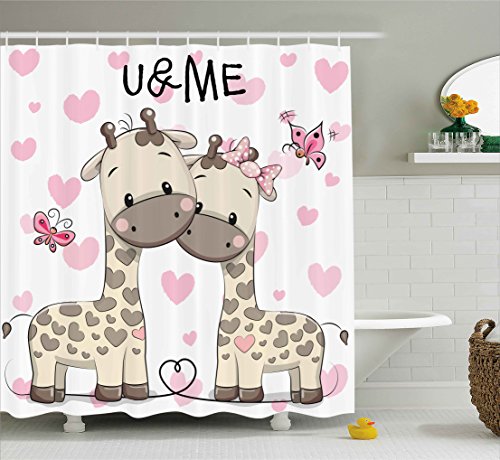Kids Decor Shower Curtain by Ambesonne, Cute Giraffes Baby in Pure Love with Butterflies and Hearts Bows Print, Fabric Bathroom Decor Set with Hooks, 70 Inches, Pink White and Grey