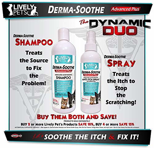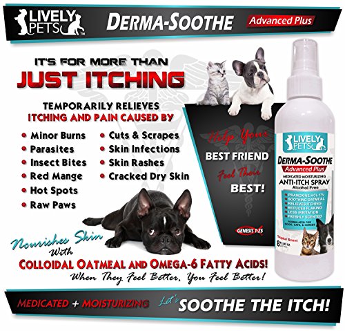 -. Feature : STOP THE ITCH! - Derma-Soothe Advanced Plus Anti-Itch spray for dogs and cats is a topical, medicated spray that will relieve your pets scratching and dry, itchy skin, and will also leave them smelling fresh with our tropical scent! / PRAMOXINE HCL 1% - Pramoxine is classified as a local anesthetic, and works by numbing the skin to block the feelings of pain and itching. It is used to temporarily relieve itching and pain caused by minor skin irritation such as minor burns, cuts, scrapes, sunburn, insect bites, eczema, and rashes! It's the best treatment for itchy dog skin to stop the scratching! / COLLOIDAL OATMEAL TO CONDITION AND PROTECT DRY SKIN - Oatmeal softens and moisturizes your pets skin, by locking in moisture and protecting skin from exterior irritants. Derma-Sooth will stop the itch and help fix some of its causes. / OMEGA 6 FATTY ACIDS - Our medicated anti-itch spray for pet also contains Omega 6 Fatty Acids that bind to your pets skin and help to lock in moisture while helping your pets body to produce its own oils for skin protection! / FOR MORE THAN JUST ITCHING! - Derma-Soothe Anti-Itch Spray is for than just itching. As a topical anesthetic, it can help relieve some of the pain associated with mange, rashes, flea bites, ticks, minor cuts, scrapes, and burns.