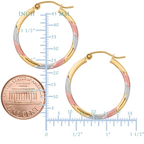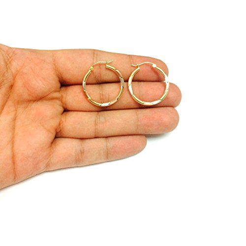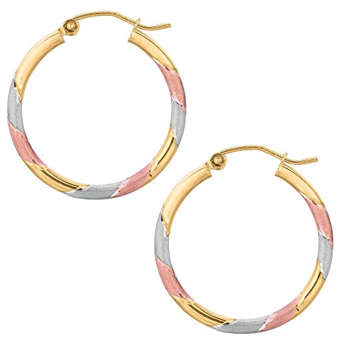 10k Tricolor White Yellow And Rose Gold Satin And Shiny Round Hoop Earrings, Diameter 25mm