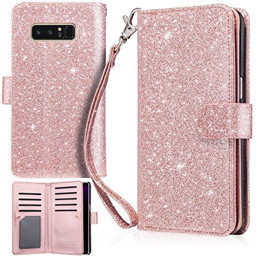 -. Feature : Model: phone case for Samsung Galaxy Note8 2017(6.3 inch) only, NOT compatible with any other phone model / Material: made of premium synthetic leather and hybrid hard PC inner part. Easy to put on and off. Precise cutouts give you full access to ports, and sensitive button covers allow responsive presses. / Multi Card Solts: Inside features 8 card slots, one ID window and cash area without having to take your wallet with you, it helps you carry many cards or ID as well as holds Galaxy Note8 / Detachable Wristlet: For easy to carry and security so you don't have to worry about where to set it down any more,Extra strong, double sided magnetic closure snaps the cover of your device,prevent cards and Galaxy Note8 from dropping. / Bling Wallet Case: Smooth surface but with sparkly vision, premium synthetic leather give your Galaxy Note8 a gorgeous feel