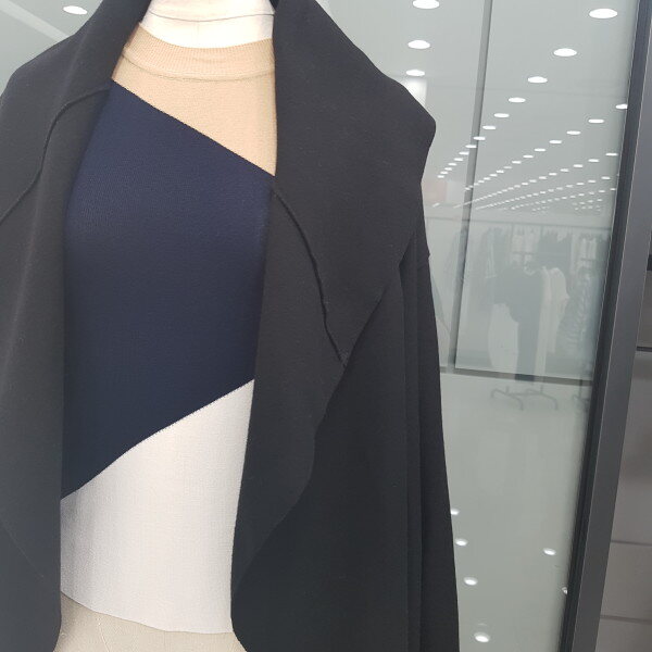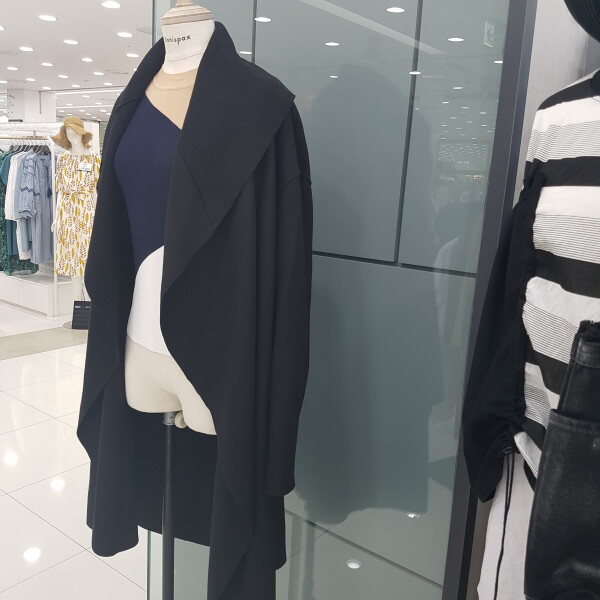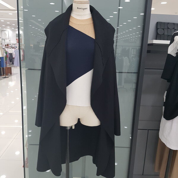 오프숄더 스타일에 얇은 핸드메이드 느낌에 코트입니다ㆍ앞라인 언발디자인이 세련되보이는 스타일 입니다