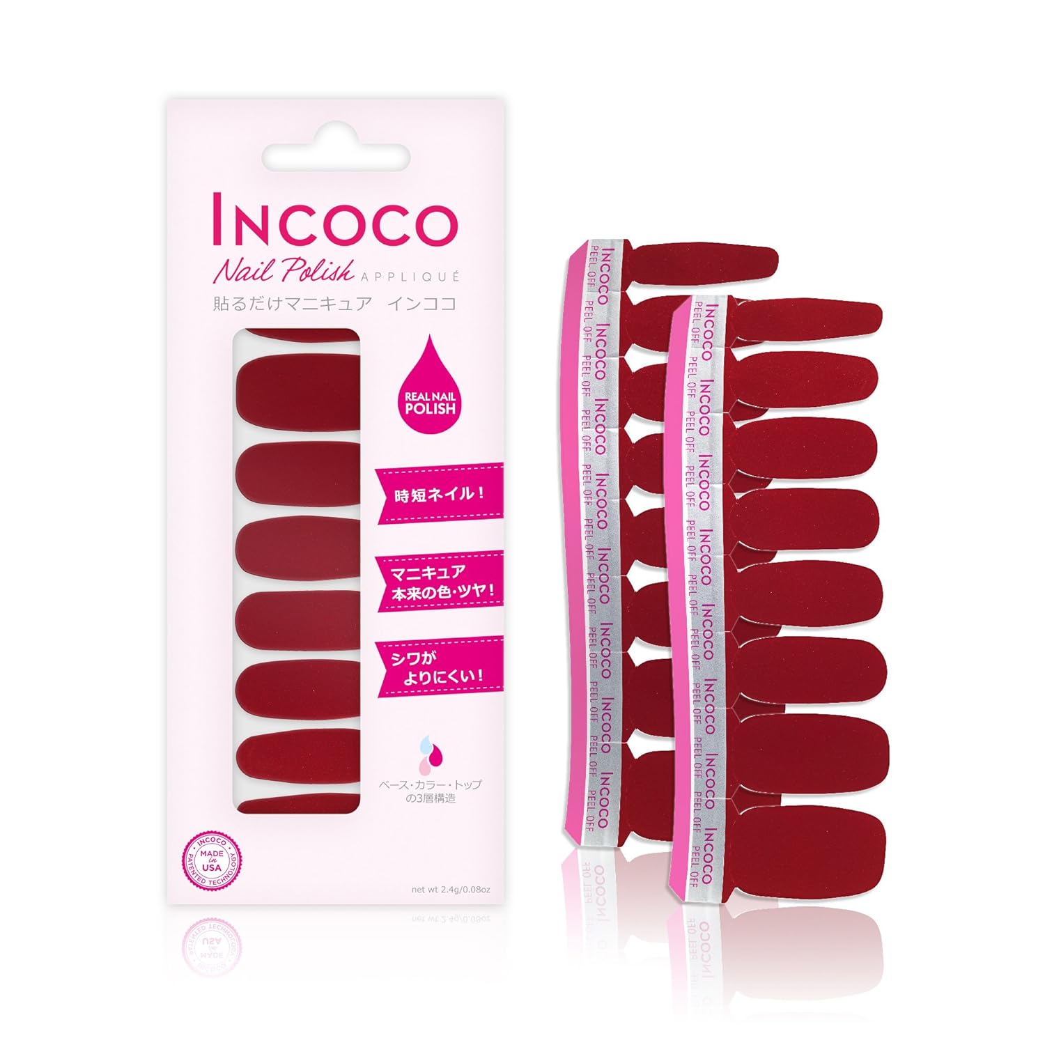 アメリカ生まれの貼るだけマニキュア 「インココ・ネイル・ポリッシュ・アップリケ」(Incoco)はマニキュア成分でできたシートタイプのマニキュアです。乾かす時間不要、塗りムラ知らず、且つマニキュアならではの発色やツヤを楽しめます。インココでまったく新しいマニキュア体験をしてみませんか!サテンのような光沢が美しい深みのある赤のカラーネイル。手触りのよいサテンドレスのような光沢が美しい深みのある赤。セクシーでスパイシーな大人のネイル。