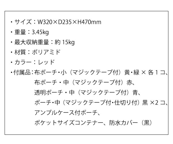 ●付属品:布ポーチ・小(マジックテープ付)黄・緑×各1コ、布ポーチ・中(マジックテープ付)赤、透明ポーチ・中(マジックテープ付)青、ポーチ・中(マジックテープ付・仕切り付)黒×2コ、アンプルケース付ポーチ、ポケットサイズコンテナー、防水カバー(黒)