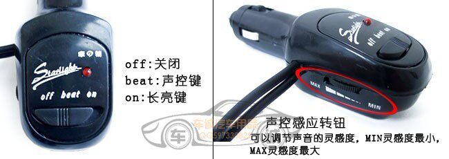LED interior lights, light music with voice, can grow light. Power directly plugged into the cigarette lighter, with a three position switch on the sound controller: a power supply, a voice, a long bright. After transferred to voice the position under paragraph sensing controller has a voice turn the knob to adjust the inspiration of the sound.