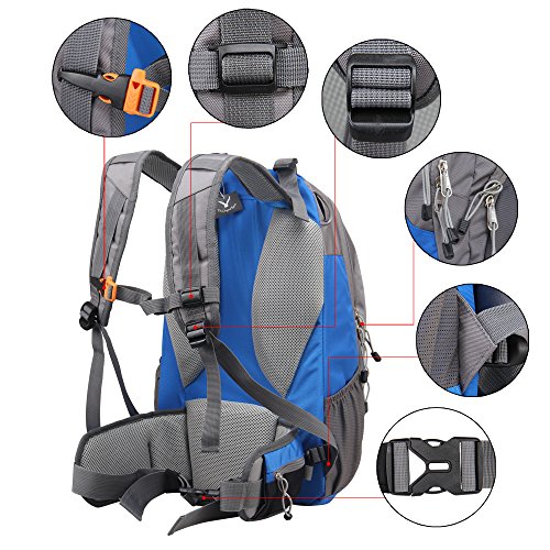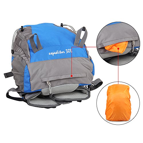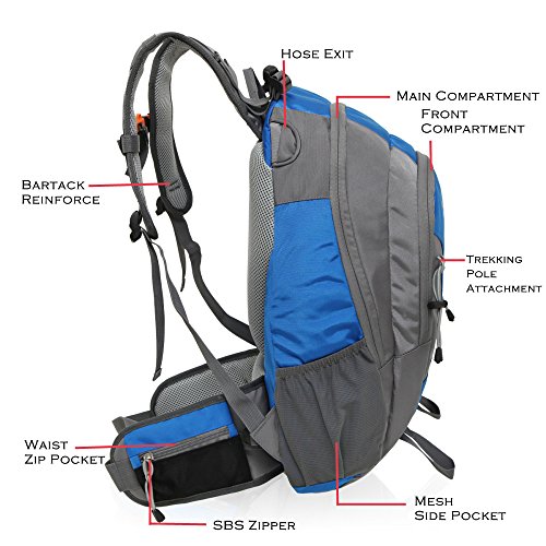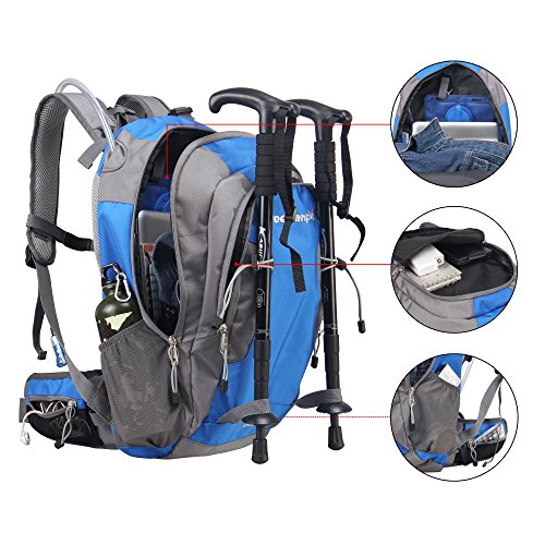 2 waist zip pockets, 2 mesh pockets and 2 compartments for storing your necessities, bottom pocket has a rain cover. This backpack can fit hydration reservoir up to 3.0L, but didn't come with reservoir and tubing