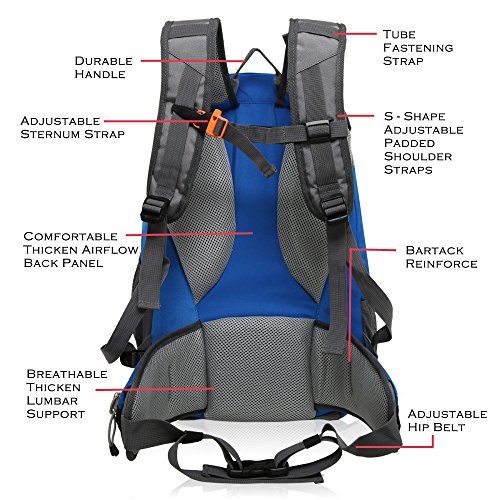 Adjustable contoured padded shoulder straps and thicken lumbar support for comfort, safety whistle on the sternum strap for emergency