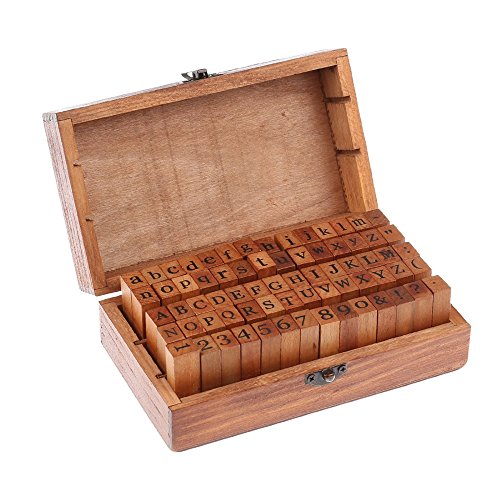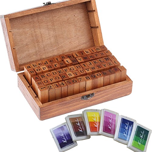 Vintage Wooden Rubber Letter Number Stamp Set + Colorful Ink Pad - Multipurpose DIY Diary Cards Stamps Craft, 70 pcs Alphabet Letter Number Symbol ( KIDS) (70 pcs + 6 color ink pad)