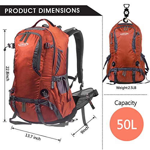 BACKPACK MATERIAL: Water Resistant Nylon, high quality pull string zippers, good ventilation, no deformation, Super versatile and multi-functional. Comparable to the High Sierra, Teton and Everest Backpacking Backpacks. Large Bearing Capacity: 50L. Size: 13.7 x 9 x 22.8 inches.