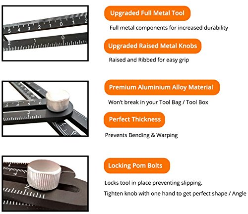 - ★QUALITY: Don't buy a cheap thin plastic ruler that will break with limited use and cause you frustration. Get our quality build multi-angle measuring ruler made of reinforced aluminium alloy metal with solid metal bolts for extra strength and laser etched markings that will stand the test of time. We include free a fabric carrying pouch for storage, a construction pencil to start your next project and an instruction booklet