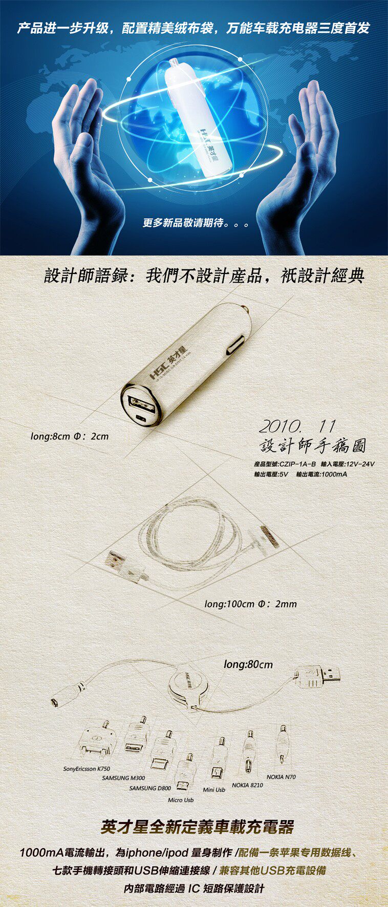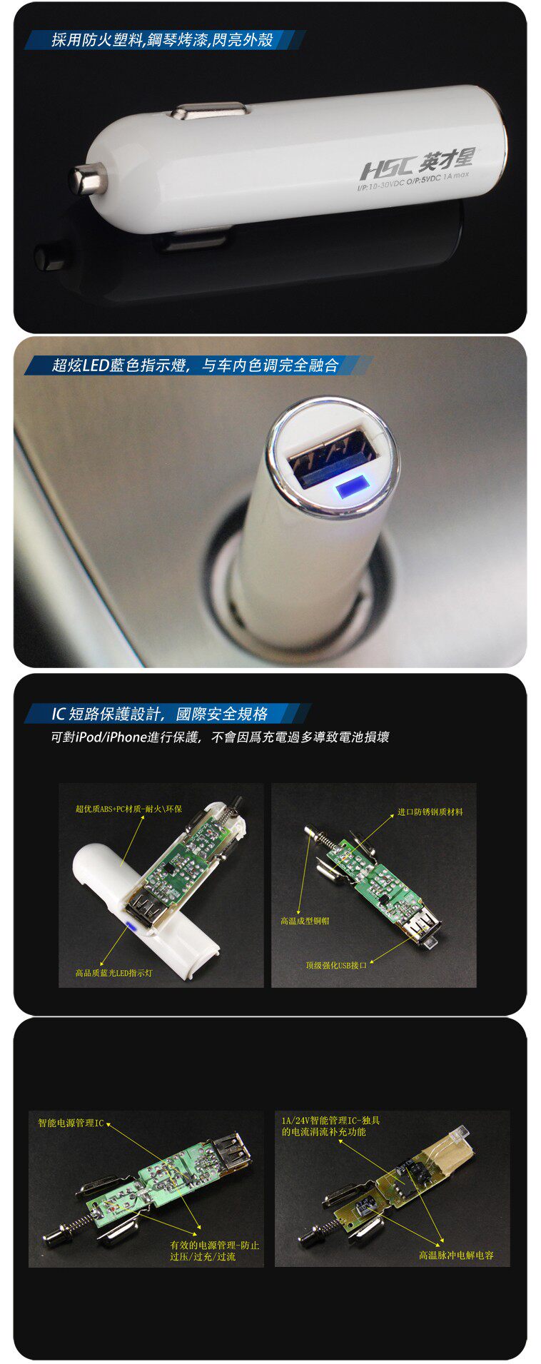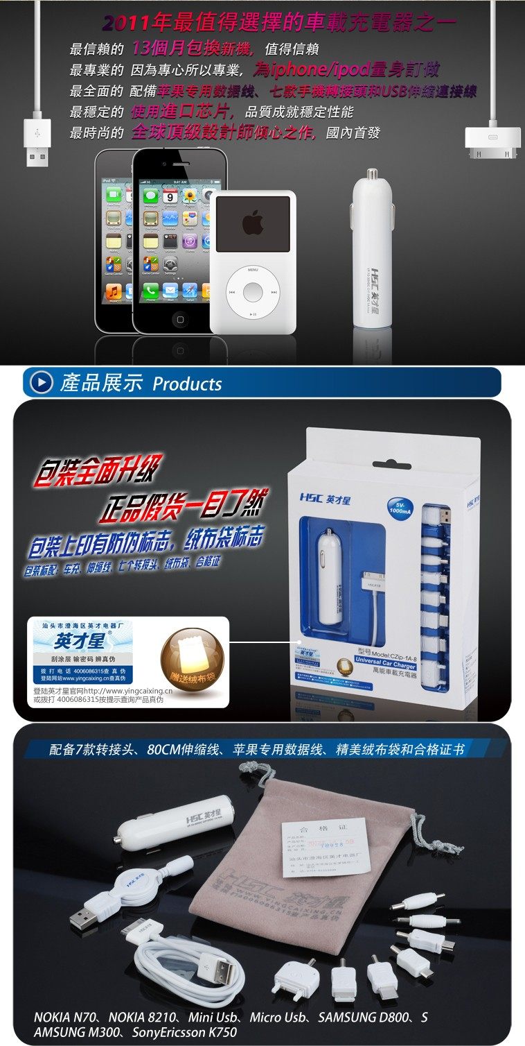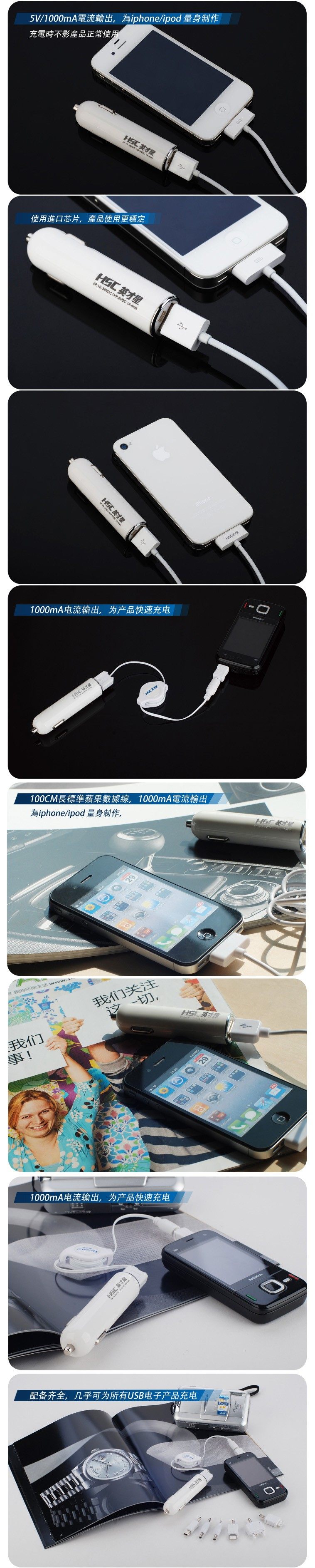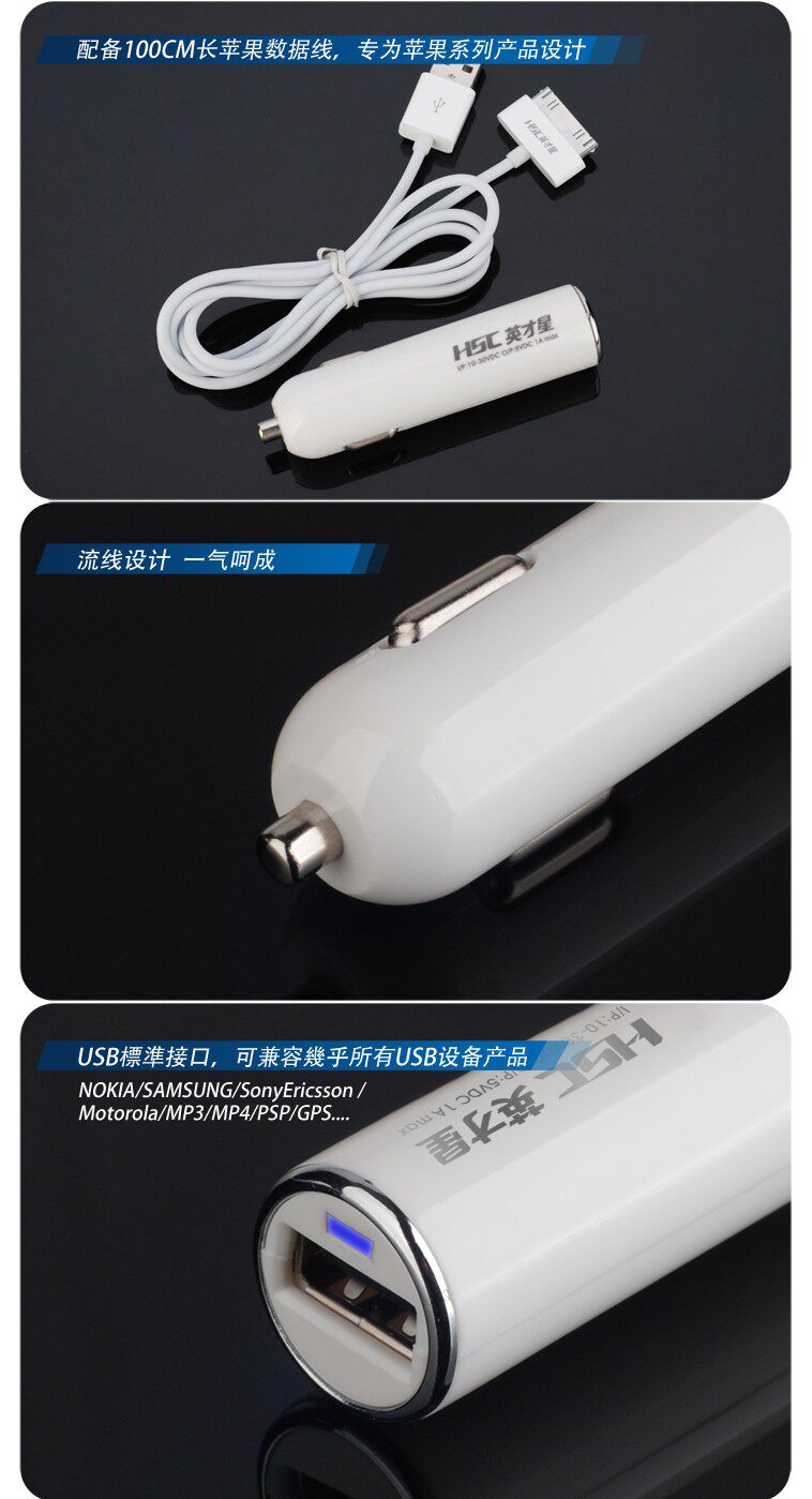 Features: iPhone Incharge Auto car charger adopts design, lightweight and portable and easy to carry, intelligent circuit protection to iPod or iPhone, not because the charging too much lead to cell damage. With LED light rechargeable is normal, USB data line charging can answer the phone in the car. InCharge Auto style is very elegant, white, tubular bodytail silver metal outer ring, looks and car charge other be quite different to traditional. InCharge Auto internal circuit is also designed for IC short circuit protection, comply with international safety standards. Goodappearance, in addition, the quality of course better than similar with fuse,car charger, rechargeable IPOD IPHONE PSP MP3 Nokia Motorola Sony Ericsson LG Samsung Dopod Palm Blackberry Meizu etc..