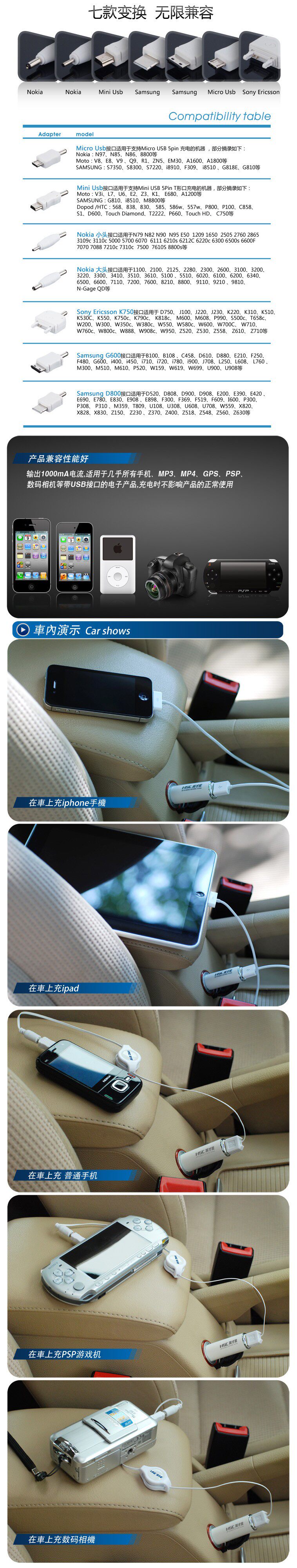 Car charger length: 8CM USB apple line: 110CM telescopic line: 80CMadapter: Seven