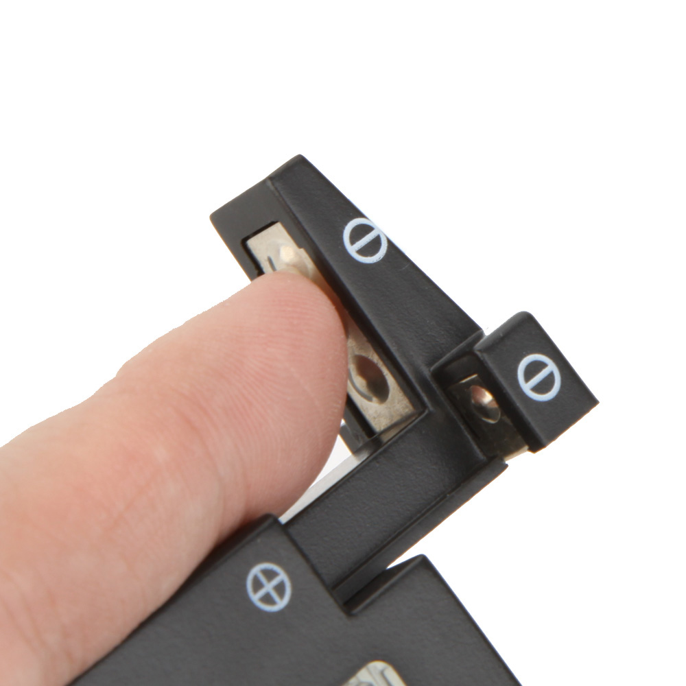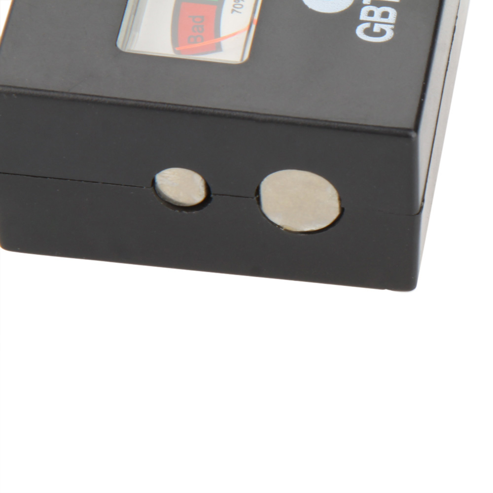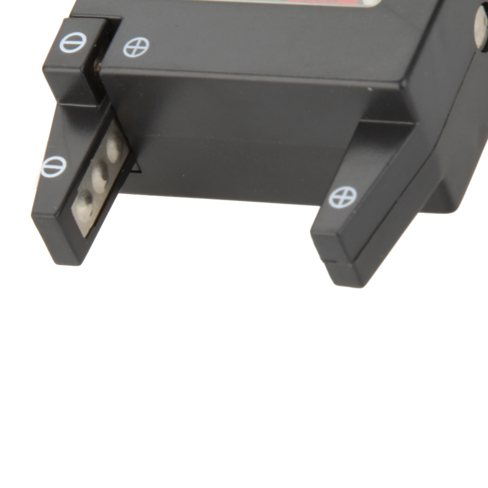 Note: Position battery between spring loaded contact arms. Make sure the positive (+) and negative (-) terminals of the battery are positioned correctly on the contacts. Observe battery condition on the tester scale. When testing 9 volt rectangular batteries, touch the battery terminals to the 9V contact points on the side of the tester